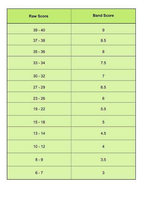 The reading test also contains 40 questions with one mark awarded for each correct answer (raw score). The score out of 40 is then converted to the IELTS nine-band scale.
