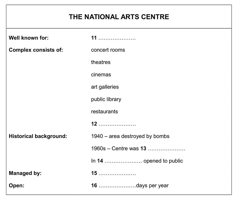 The recording for this sample question is a radio broadcast about The National Arts Centre. You are required to fill in six pieces of missing information about the centre.