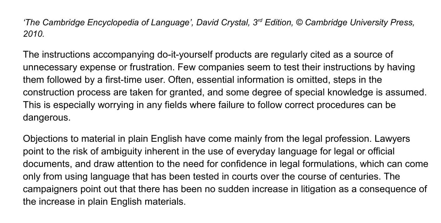 Objections to material in plain English have come mainly from the legal profession. Lawyers point to the risk of ambiguity inherent in the use of everyday language for legal or official documents, and draw attention to the need for confidence in legal formulations, which can come only from using language that has been tested in courts over the course of centuries.